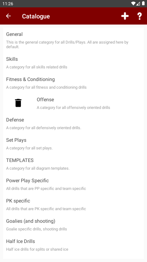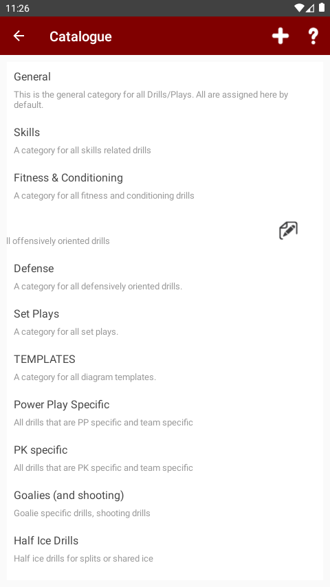 When TeamsCoach first configures the chosen sport, default catagory folders are created for you. These are: General, Skills, Fitness & Conditioning, Offense, Defense, Set Plays and TEMPLATES.