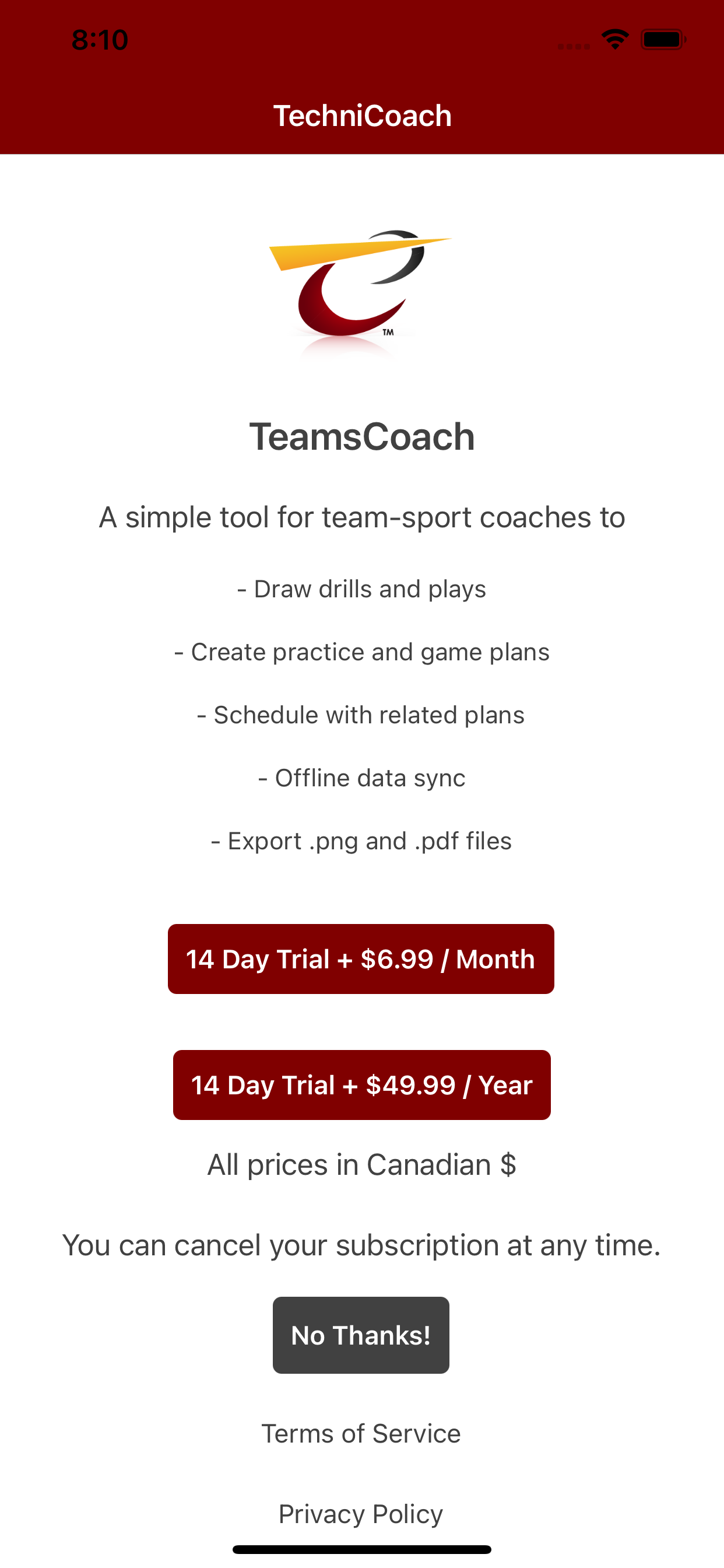 When TeamsSport app starts for the first time, you will need to do 3 things - Login/Register, select your sport, select a trial/subscription plan.